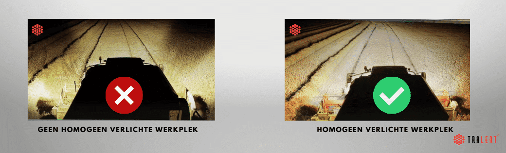 Met goed afgestelde homogene verlichting is dit natuurlijk een ander verhaal. Door het werklicht rondom je trekker gelijkmatig te verdelen, zorg je ervoor dat deze donkere, abrupte donker/licht spots er niet meer zijn. De focus van het licht uit de werklamp ligt in het midden en de zachtere delen van de lichtstraal kruisen elkaar op het juiste moment. Hierdoor ontstaat een gelijkmatig helder zicht in alle richtingen rondom jouw trekker. Dit maakt je als bestuurder instaat gevaren eerder te herkennen en hier accurater op te reageren. Wél zo prettig voor jou en je collega’s. In de bovenstaande afbeelding (foto 2) is een voorbeeld opgenomen van een juist verlichte werkomgeving dankzij een juiste montage van LED werklampen.