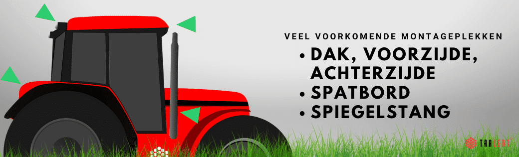 Omdat het advies op twee meter ligt voor de montage van een werklamp, is het dak van jouw trekker een veel voorkomende plek voor montage. Andere veel voorkomende plekken om werklicht te bevestigen zijn het spatbord en de spiegelstang. Vaak zijn dit kleinere TRALERT® werklamp modellen die worden ingezet voor het verlichten van bijvoorbeeld één specifieke functie. Bij montage op het dak, bekijk goed jouw trekker-dak om te ontdekken of er voorbereidde plekken bestaan voor de TRALERT® werklampen. Vaak op de plekken van de bestaande halogeen verlichting kun je onze LED werklampen monteren. Mocht dit niet het geval zijn, dan kun je altijd om advies vragen bij een TRALERT® specialist. Wil je graag speciale plekken belichten? Je kunt dan altijd additionele LED werklampen monteren aan bijvoorbeeld de spiegelstang of het spatbord.