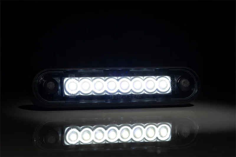 De Fristom MV-2400 serie is ontwikkeld voor gebruik als LED markeringslichten op voertuigen die opereren binnen een spanningsbereik van 12–24 V. Dit model combineert een reflectorfunctie met een witte lichtkleur, geschikt voor montage aan de voorzijde van voertuigen. Door de behuizing van polycarbonaat en rubber is het product bestand tegen externe invloeden, met een compacte afmeting van 120 x 27,7 x 12,8 mm voor flexibele montage op verschillende voertuigtypes.