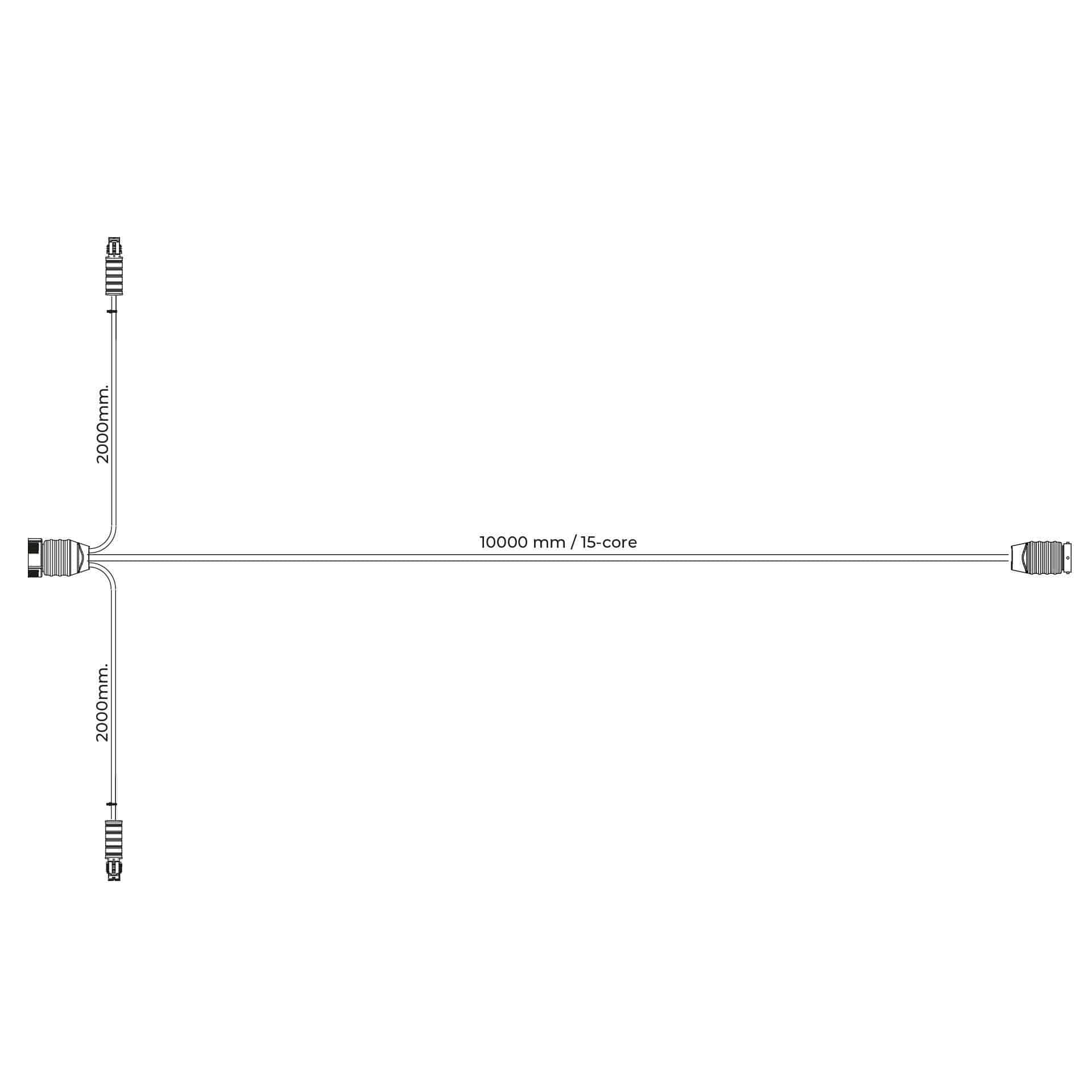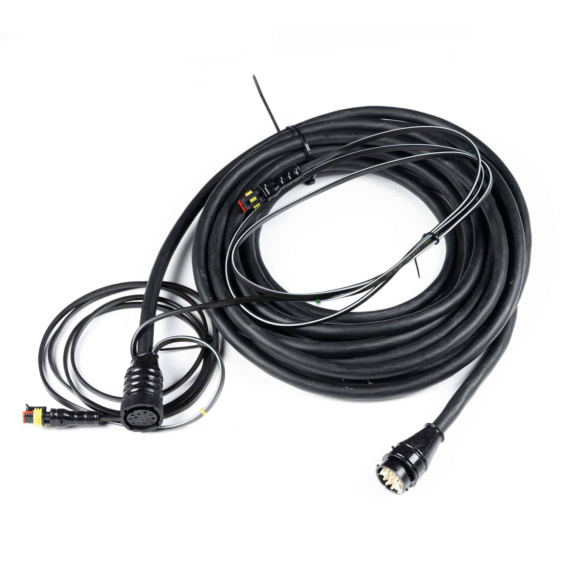 Deze kabelboom voor trucks en trailers is ontworpen voor 24 V toepassingen en maakt deel uit van een modulair systeem. Met een lengte van 10 meter biedt deze hoofdkabel met zij-kabel flexibiliteit en gebruiksgemak. De kabel is voorzien van 15 aders en 2 bajonetconnectoren met 15 pinnen, wat een betrouwbare verbinding garandeert tussen de verschillende elektrische componenten van uw voertuig.