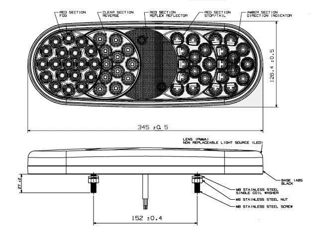 De afmetingen van 345x126x39 mm maken het geschikt voor plaatsing op grotere voertuigen. De aansluiting vindt plaats via een open draadeind met een 50 cm lange kabel, optioneel te combineren met een Deutsch-connector. Dit model beschikt over diverse ECE-certificeringen, waaronder ECE-R10, ECE-R6, ECE-R7 en ECE-R23. Hiermee voldoet het aan de vereisten voor gebruik op openbare wegen.