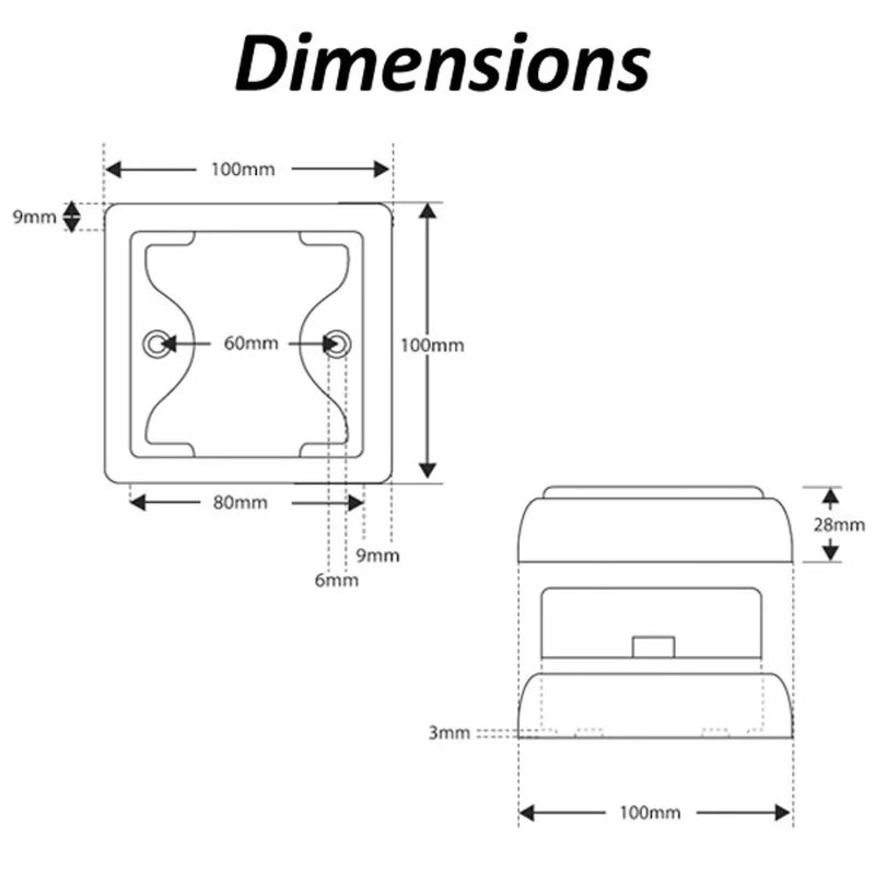 De behuizing is vervaardigd uit ABS en voorzien van een acrylaat lens. Dit model is uitgevoerd als opbouwvariant met een 40 cm kabel en een open draadeind-connector, geschikt voor directe aansluiting. De afmetingen bedragen 100x100x28 mm. De beschermingsklasse IP67 garandeert stof- en waterdichtheid voor gebruik onder zware omstandigheden. Dit product voldoet aan CE, ECE-R10 en ECE-R23 certificeringen.