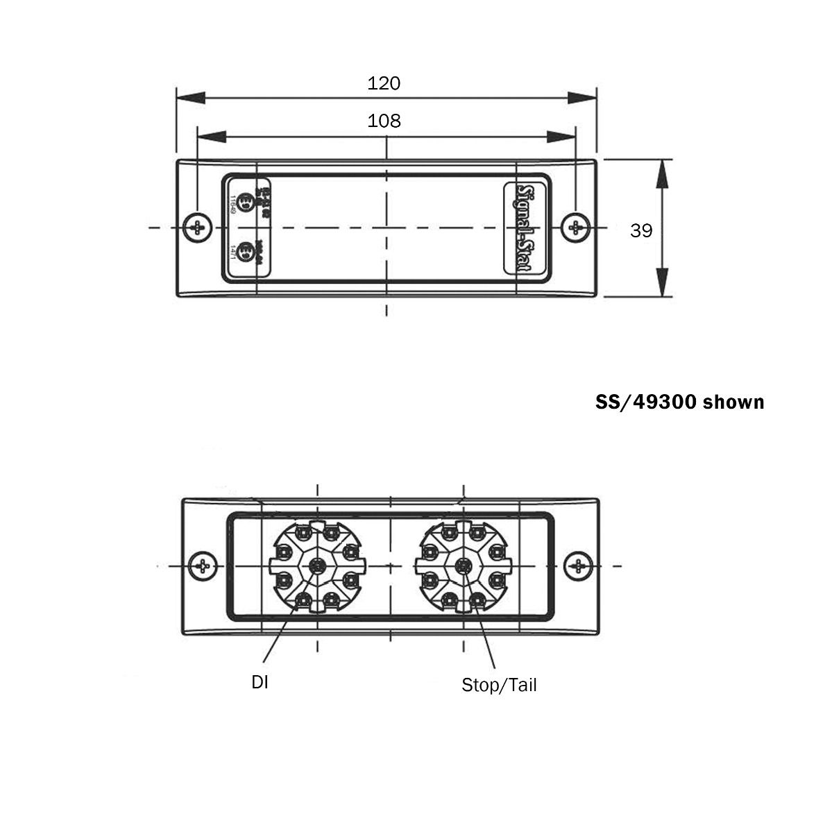 De montage kan zowel horizontaal als verticaal worden uitgevoerd. De afmetingen van 121x39x19 mm maken dit model geschikt voor toepassingen waarbij beperkte inbouwruimte beschikbaar is. Het armatuur is voorzien van een open draadeind en een kabellengte van 30 cm. De SS/49-serie voldoet aan de certificeringen CE, ECE-R10, ECE-R23, ECE-R38 en ADR.