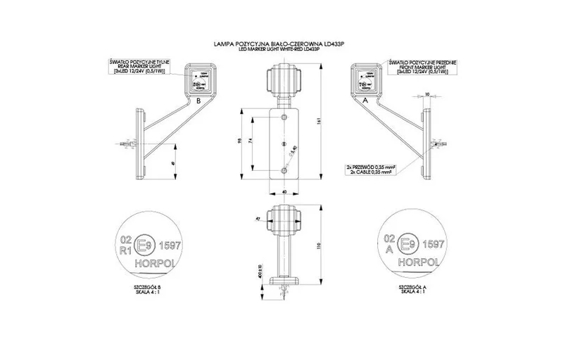 De Horpol MB-4662RW uit de MB-4600 serie is een LED breedtelamp met een rood-witte lichtkleur en is ontworpen voor montage aan de rechterzijde van voertuigen. Deze breedtelamp is geschikt voor opbouwmontage en wordt geleverd met een 40 cm lange kabel met open draadeind. De behuizing is vervaardigd uit rubber voor verhoogde schokbestendigheid en de lens bestaat uit slagvast polycarbonaat. Het product werkt binnen een multivoltagebereik van 12–24 V en is daarmee toepasbaar op diverse voertuigen. Dankzij de IP68-classificatie is deze LED breedtelamp stof- en waterdicht, wat de inzetbaarheid in verschillende weersomstandigheden vergroot.