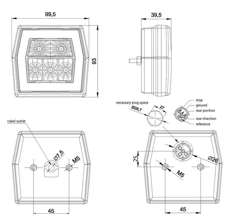 Dit LED achterlicht uit de 700-serie van Fristom is geschikt voor voertuigen met een spanningsbereik van 12–24 V. Dankzij de opbouwmontage en de 5-PIN’s bajonetaansluiting is het eenvoudig te installeren in uiteenlopende toepassingen binnen de automotive sector. Het vierkante achterlicht combineert de functie knipperlicht met een geïntegreerde reflector in een compact formaat van 99,5 x 93 x 39,5 mm. De behuizing bestaat uit polycarbonaat en rubber, met een polycarbonaat lens voor verhoogde slagvastheid en duurzaamheid.