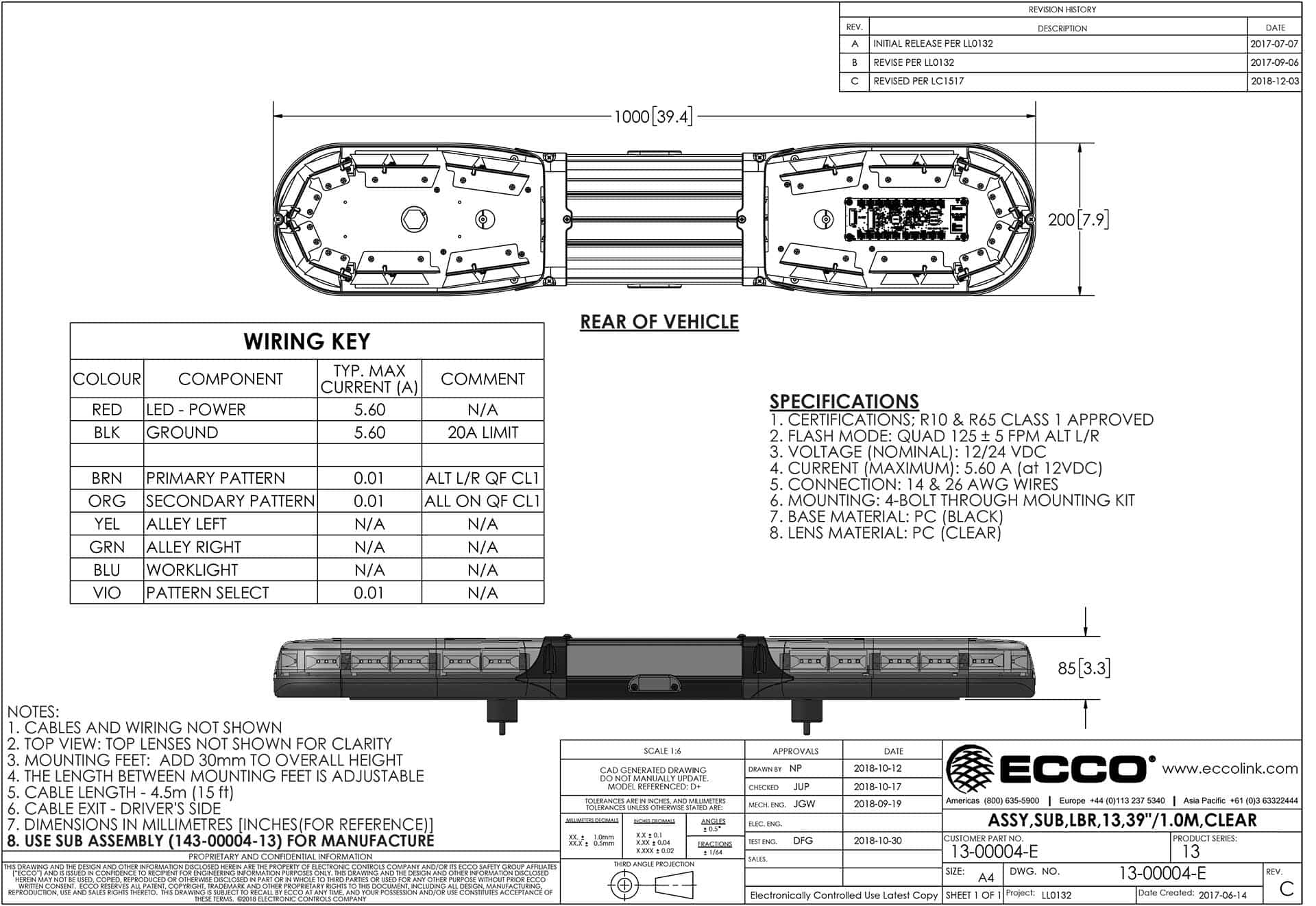De ECCO ESG 13 serie Ecco is een LED zwaaibalk met een lengte van 1.000 mm, ontworpen voor waarschuwings- en signaleringstoepassingen op bedrijfsvoertuigen. De zwaaibalk ondersteunt een spanningsbereik van 12–24 V en is voorzien van een vrij instelbare beugelmontage voor flexibele installatie. De behuizing is vervaardigd uit aluminium, in combinatie met een slijtvaste polycarbonaat lens voor duurzaamheid onder uiteenlopende weersomstandigheden. Deze LED zwaaibalk voldoet aan CE-, ECE-R10- en ECE-R65 Class 1-certificeringen, waarmee elektromagnetische compatibiliteit en zichtbaarheid binnen de Europese regelgeving worden ondersteund. De unit wordt geleverd met een open draadeind en een aansluitkabel van 450 cm.
