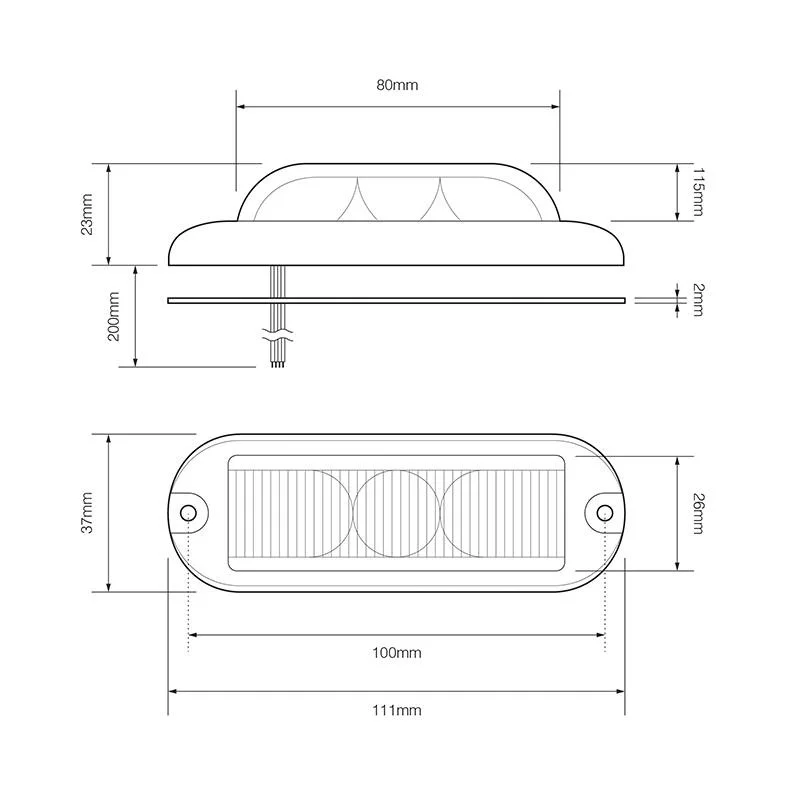 De flitser is voorzien van drie LED’s die samen een lichtdekking van 180 graden bieden. Dankzij de EMC-ontstoorde opbouw voldoet het product aan de eisen van CE en ECE R10. De bescherming volgens IP67 maakt het geschikt voor gebruik in vochtige en stoffige omgevingen. Aansluiting gebeurt via een open draadeind met 20 cm kabel, wat installatie vergemakkelijkt.