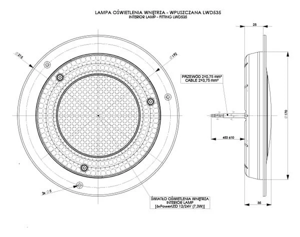 Met een lichtopbrengst van 690 lm en een afmeting van ø215 x 33,5 mm biedt deze LED interieurverlichting een brede lichtverdeling. De behuizing is vervaardigd uit polycarbonaat en voldoet aan de IP68-classificatie, wat aangeeft dat het product bestand is tegen stof en langdurige onderdompeling. De LED unit is CE-gecertificeerd en voldoet aan ECE R10 normen voor elektromagnetische compatibiliteit.