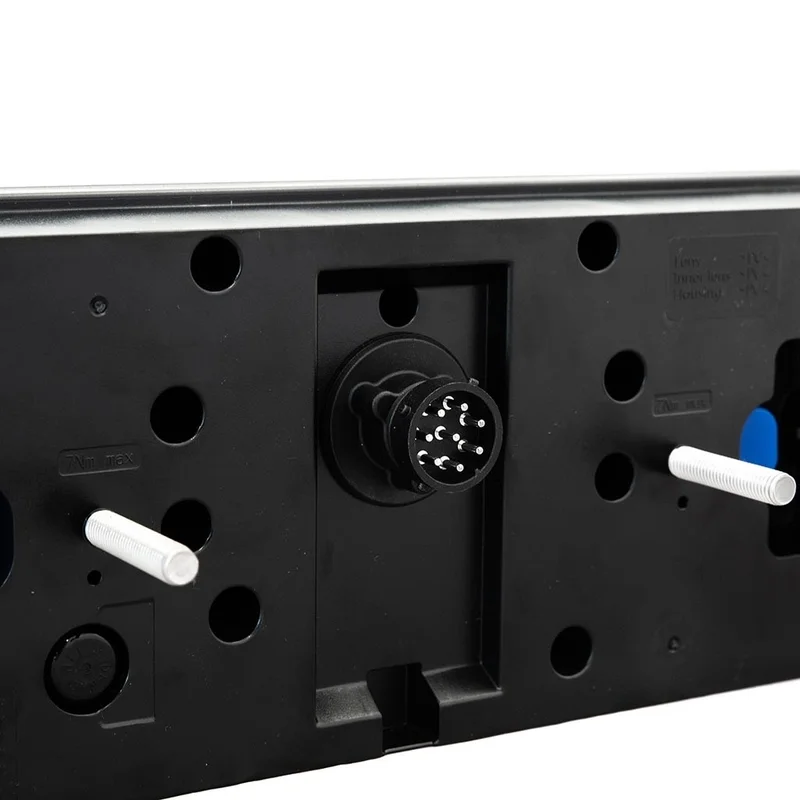 Dit achterlicht combineert de functies: achterlicht, remlicht, knipperlicht, dynamisch knipperlicht, mistlicht en achteruitrijlicht. De verlichting wordt aangesloten via een 8-PIN bajonetverbinding in combinatie met vier SuperSeal-connectoren, wat zorgt voor flexibele aansluitmogelijkheden.