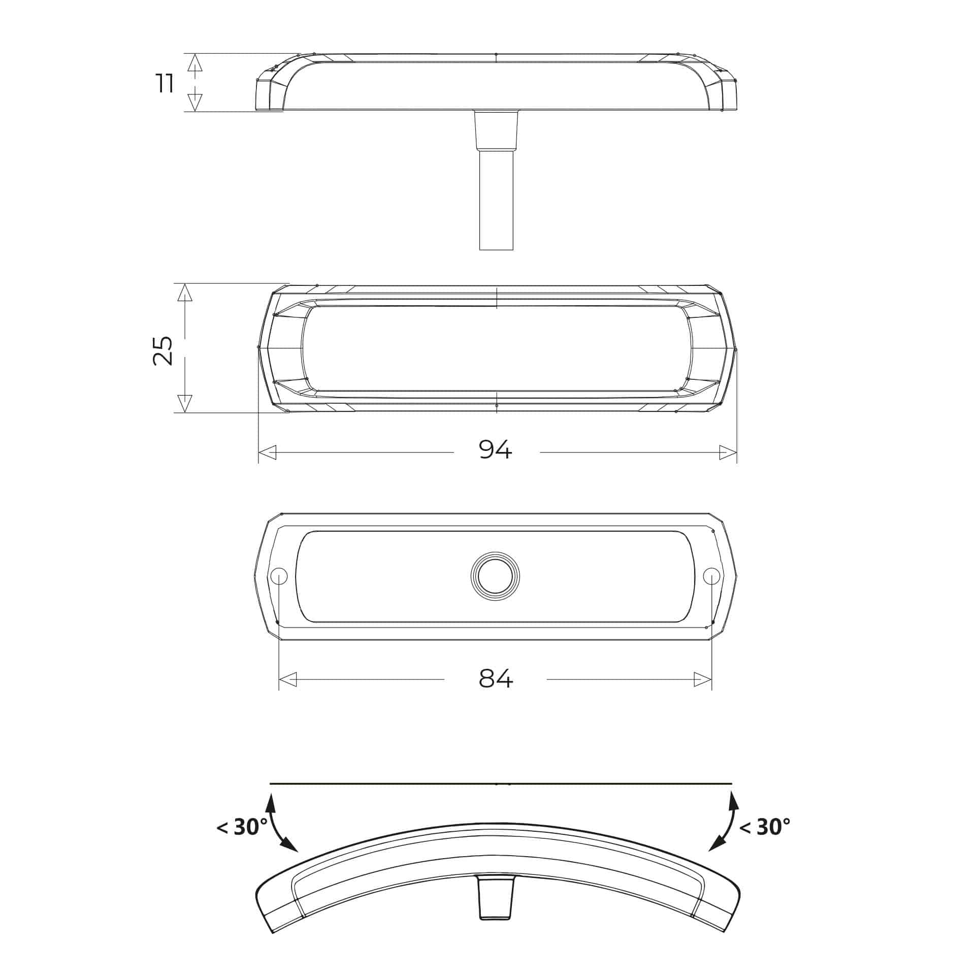 De afmetingen van 94x25x11 mm maken deze LED flitser geschikt voor toepassingen met beperkte montageruimte. De flitser functioneert op 12–24 V en wordt geleverd met een 200 cm lange aansluitkabel met open draadeind. De lens is vervaardigd uit slagvast polycarbonaat. Dit model voldoet aan de certificeringen CE, ECE-R10 en ECE-R65 Class 2 en heeft beschermingsklasse IP69K, wat het geschikt maakt voor intensieve omgevingen in transport, hulpverlening en bouwverkeer.