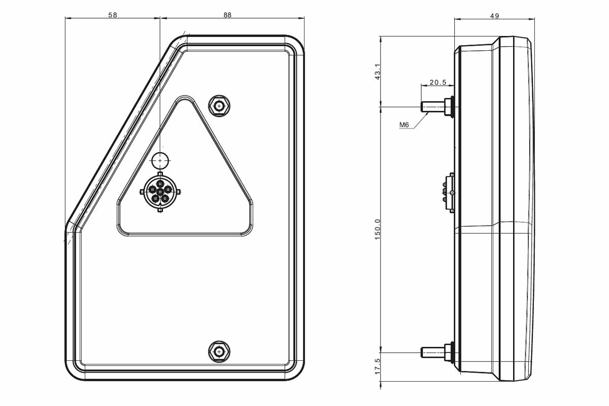 Zowel de behuizing als de lens zijn vervaardigd uit polycarbonaat, wat bijdraagt aan een robuuste constructie. De bescherming tegen stof en vocht is vastgelegd in de IP68-classificatie. Verder voldoet dit model aan diverse ECE-regelgevingen, waaronder ECE R10, R3, R6, R7, R23 en R38, wat de inzetbaarheid in uiteenlopende voertuigcategorieën ondersteunt. Aansluiting verloopt via een 6-PIN’s bajonetconnector.