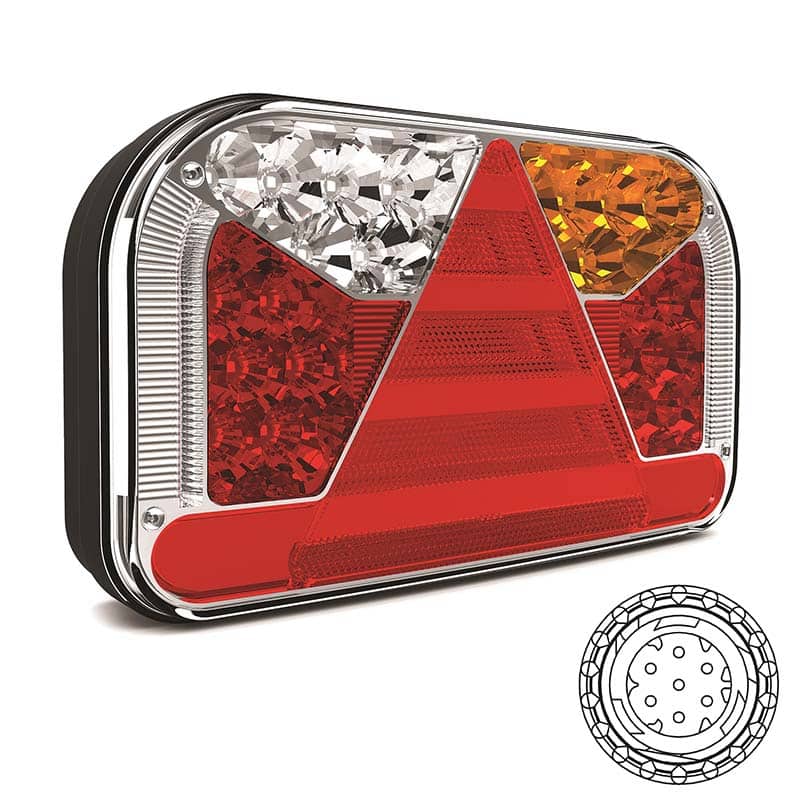 Dit achterlicht combineert de functies: achterlicht, remlicht, knipperlicht, mistlicht en achteruitrijlicht. Daarnaast is het uitgevoerd met een geïntegreerde reflector. De IP68-classificatie garandeert volledige bescherming tegen stof en langdurige onderdompeling in water. Certificeringen volgens CE, ECE-R10, ECE-R6, ECE-R7, ECE-R23 en ECE-R38 onderstrepen de geschiktheid voor weggebruik binnen Europa.
