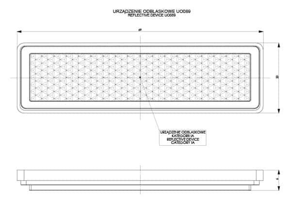 De behuizing is vervaardigd uit polycarbonaat, wat zorgt voor een duurzame en slagvaste constructie. De reflector is CE-gecertificeerd en voldoet aan de ECE-R3 richtlijn, waardoor deze geschikt is voor gebruik binnen de gestelde Europese regelgeving voor reflecterende voertuigcomponenten.