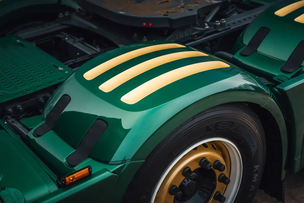 De DAF XG+ is gespoten in de kenmerkende ‘British Racing Green’ met BBS gouden velgen voor de stoere, ‘High Performance’ uitstraling. De high performance verlichting van TRALERT® sluit hier perfect op aan.