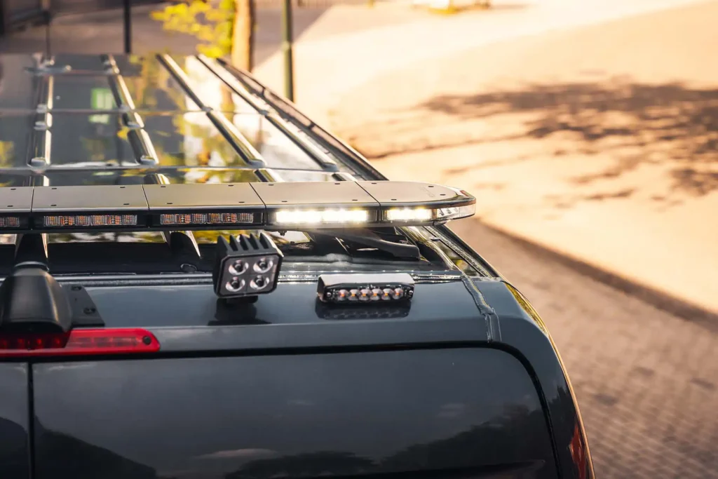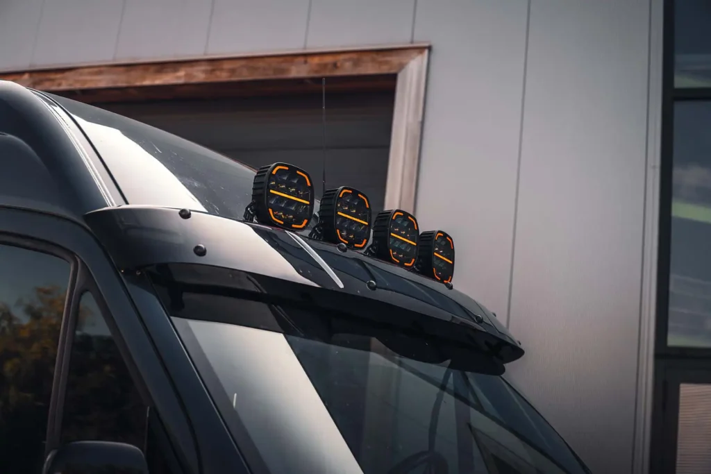 Om te voldoen aan de wettelijke vereisten in verschillende Europese landen én om ook ’s nachts veilig te werken, is voor deze Mercedes-Benz Sprinter voor betrouwbare en volledig gecertificeerde verlichting gekozen.
