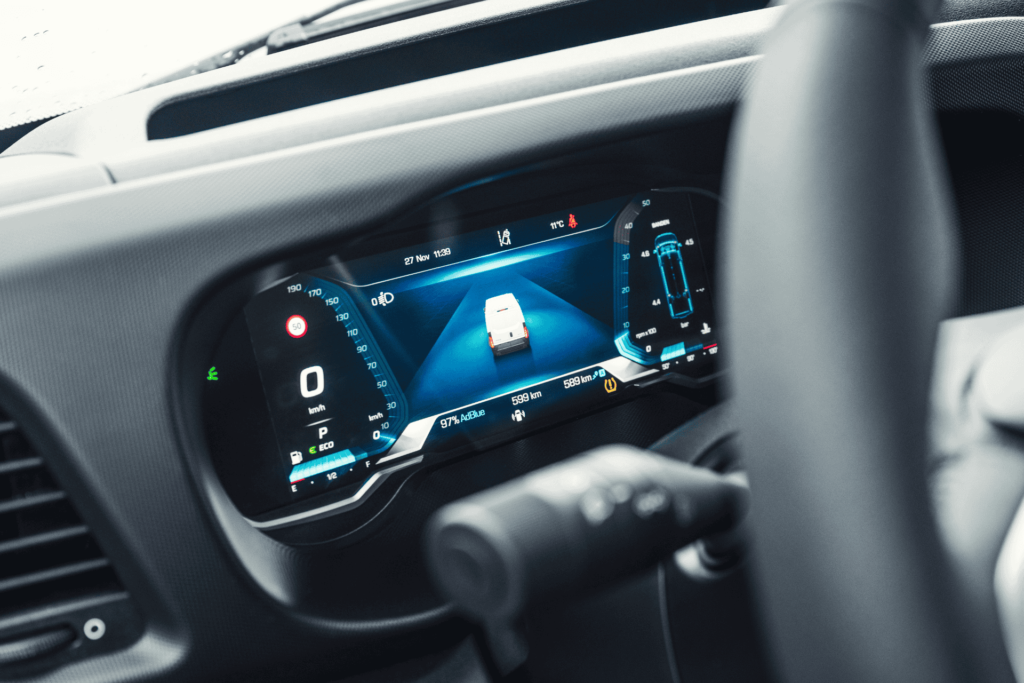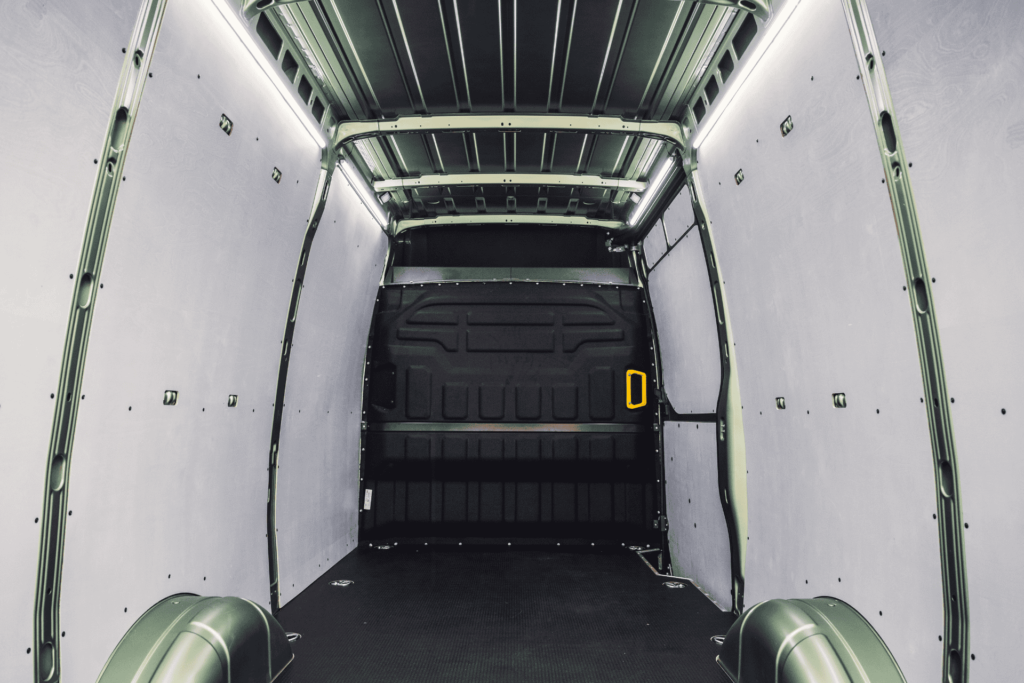 De bestelwagen is onder andere uitgerust met speciale werklampen voor verbeterde zichtbaarheid en veiligheid. Deze achteruitrijlampen met geïntegreerde flitsers zijn namelijk boven de laadruimte op de hoeken gepositioneerd, wat zorgt voor optimaal zicht bij het achteruitrijden en bij het uitladen. Ook vallen de waarschuwingslichten op deze plek goed op. Dit is cruciaal bij het waarschuwen van medeweggebruikers in bijzondere situaties.